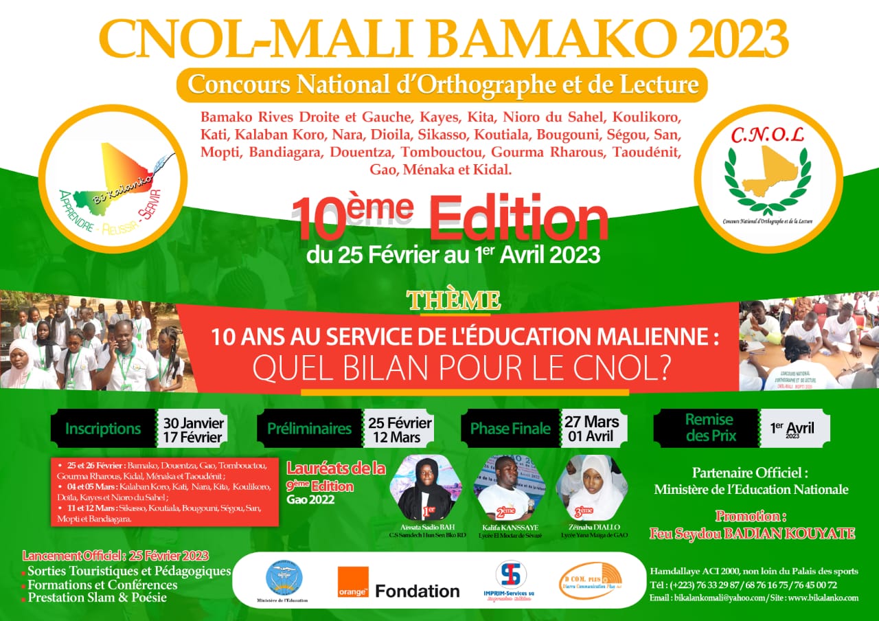 Le Concours National d'Orthographe et de Lecture (CNOL) est une compétition interscolaire ayant pour but de créer un espace à travers lequel les établissements publics et privés vont mettre en exergue leurs savoirs et leurs savoir-fairesous la houlette de l'Association BI KALANKO en partenariat avec le Ministère de l'Education nationale. Concours portant sur la sensibilisationdu public scolaire à la problématique de la Lecture et de l'Orthographe. Par sa vocation de formation pédagogique, didactique et citoyenne, le CNOL cultive chez nos enfants le goût de la lecture, et par ricochet celui de la culture, car la lecture constituent un binôme.